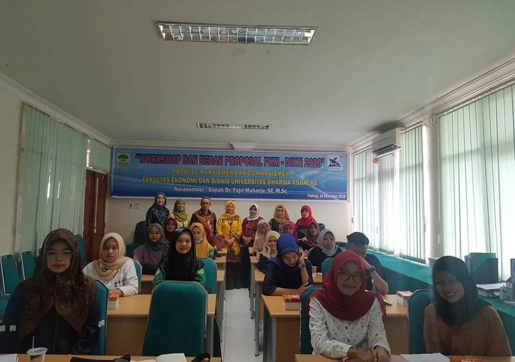 Workshop dan bedah proposal PKM-DIKTI 2020″, yang diselenggarakan oleh Prodi S1 Manajemen dan Prodi D3 Manajemen Fakultas Ekonomi dan Bisnis Universitas Dharma Andalas. Kegiatan ini dibuka langsung oleh Dekan FEB Unidha, Ibu Dr. Asniati, SE, MBA, Ak, CA, CSRA. Narasumber Bapak Dr. Fajri Muharja, SE, MSc.