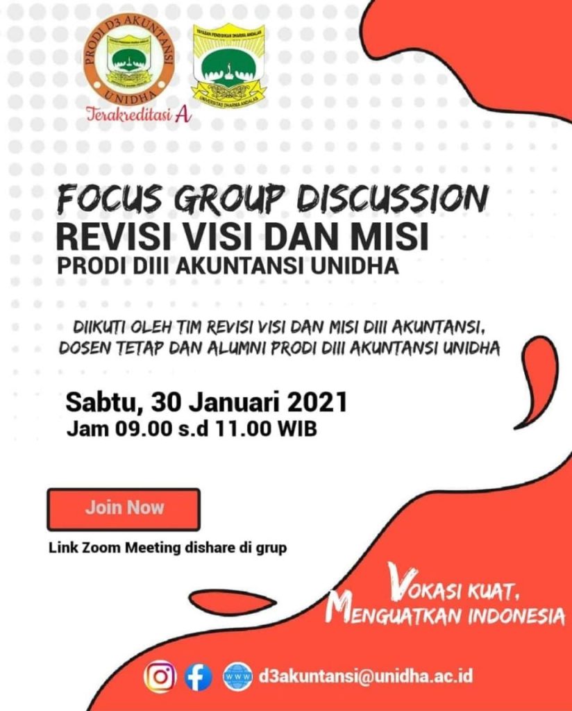 Alhamdulillah telah terlaksana FGD Revisi Visi dan Misi Prodi D3 Akuntansi UNIDHA,,,,,kami dari prodi mengucapkan terimakasih kepada semua Alumni yang sudah bersedia bergabung dan memberikan saran kepada Prodi D3 Akuntansi untuk perubahan visi dan misi, perbaikan kurikulum dan proses pembelajaran yg relevan dengan dunia kerja. Semoga Prodi kita bisa mewujudkan Visi dan Misi kita kedepannya. Aamiin Ya Rabbal Alamin.